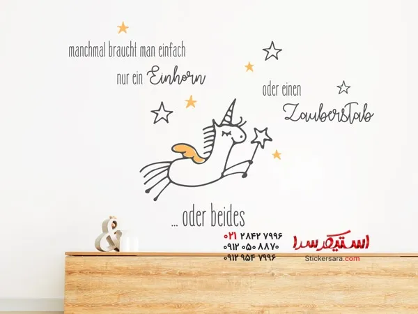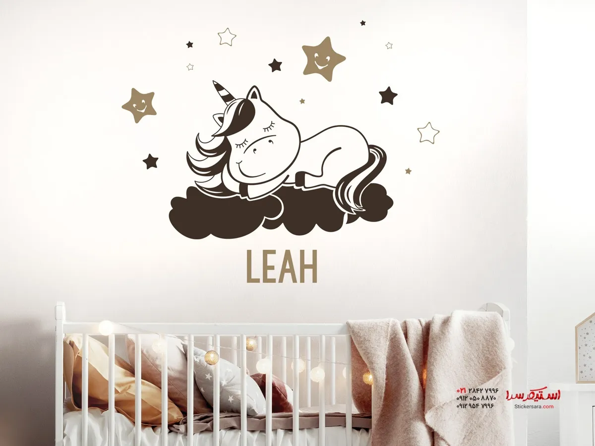 نمونهای از برچسب دیواری تکشاخ قابل تنظیم، تکشاخ خوابیده ما با نام خود کودک است . با این برچسب دیواری، علاوه بر نام دلخواه، اندازه و رنگ طرح را نیز میتوان از بین گزینههای مختلف انتخاب کرد.