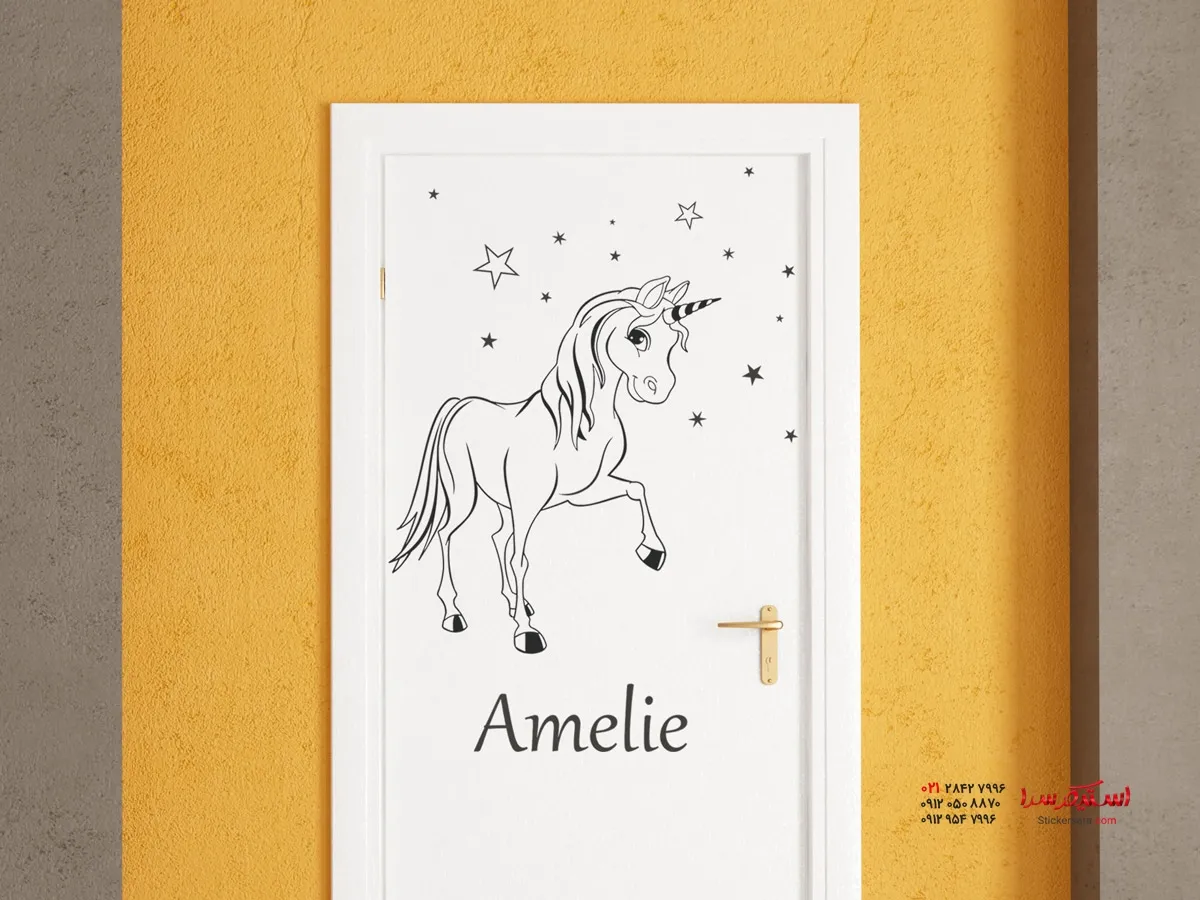 سلام! – برچسب دیواری اسب تک شاخ به عنوان تابلوی درب