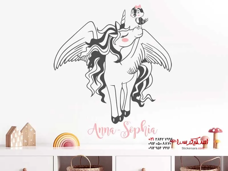 استیکر دیواری اسب تک شاخ با طرح پرندگان کوچک