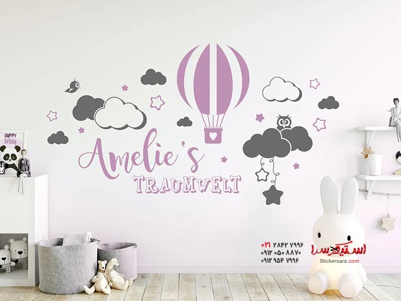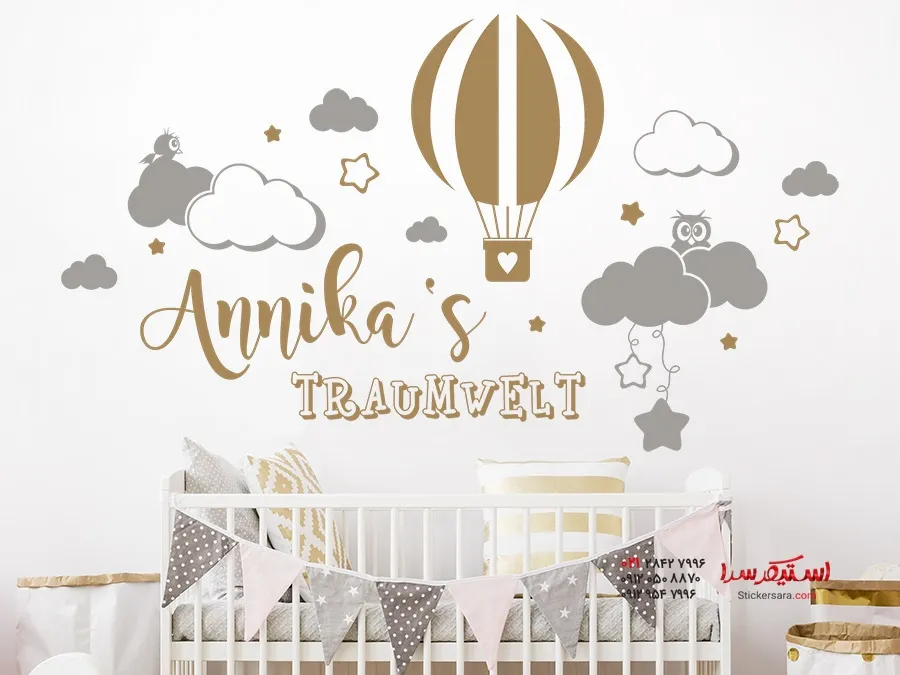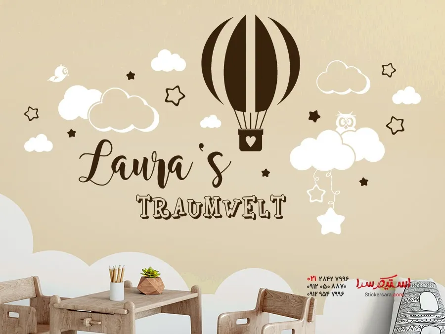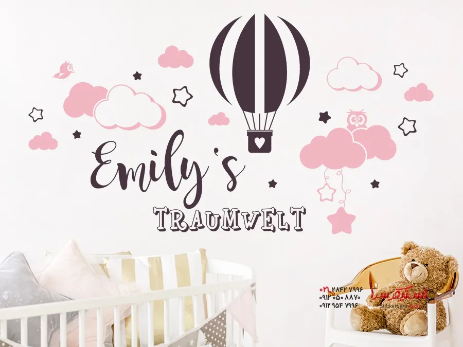 برچسب دیواری دنیای رویایی با نام و بادکنک هوای گرم