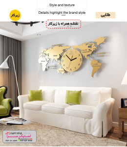 خرید نقشه جهان روی دیوار بزرگ سه بعدی برجسته و ساعت در رنگ طلای گلد و نقره ای سیلور