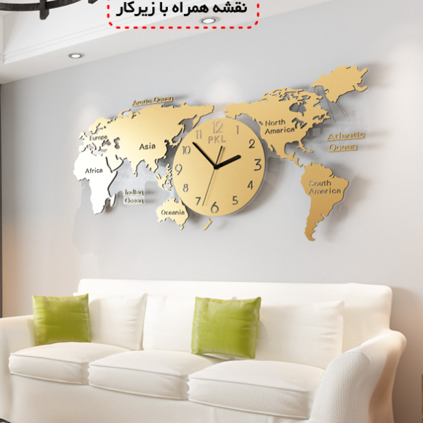 خرید نقشه جهان روی دیوار بزرگ سه بعدی برجسته و ساعت در رنگ طلای گلد و نقره ای سیلور