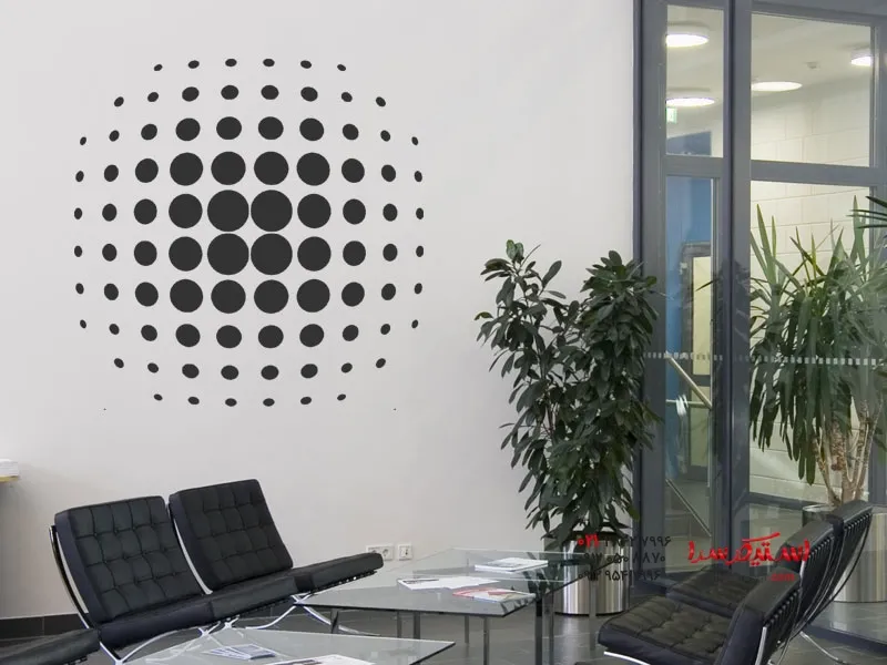 دایرههای برچسب دیواری سه بعدی به گونهای چیده شدهاند که برای بیننده طوری به نظر میرسد که انگار دیوار واقعاً به سمت جلو برآمده است.