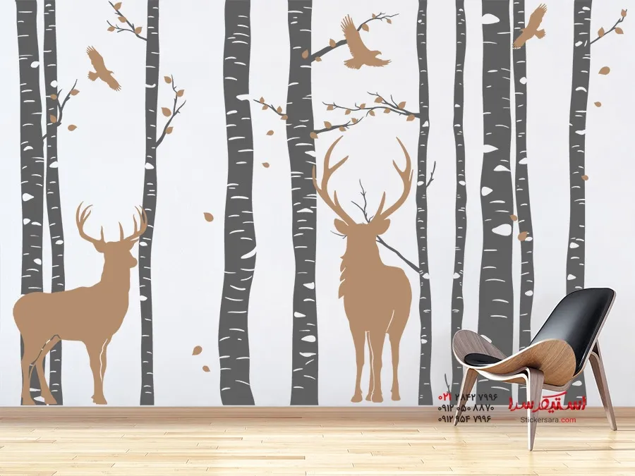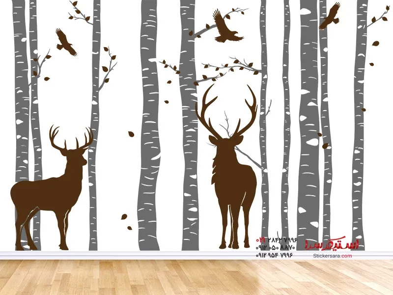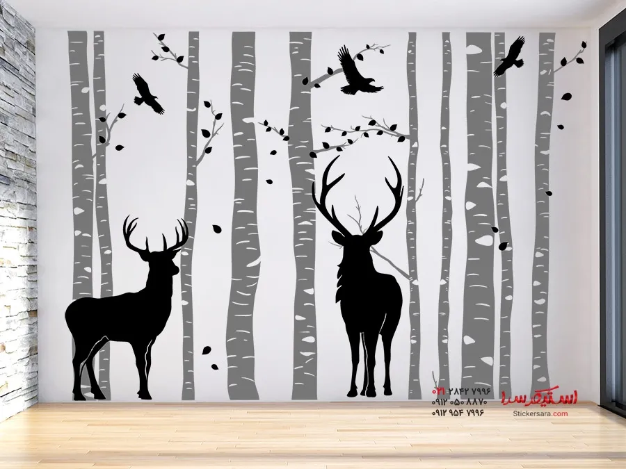 با این برچسب دیواری دو رنگ جنگل توس با طرح گوزن و پرندگان در حال پرواز، منظرهای طبیعی از جنگل را در خانه خود تداعی کنید.