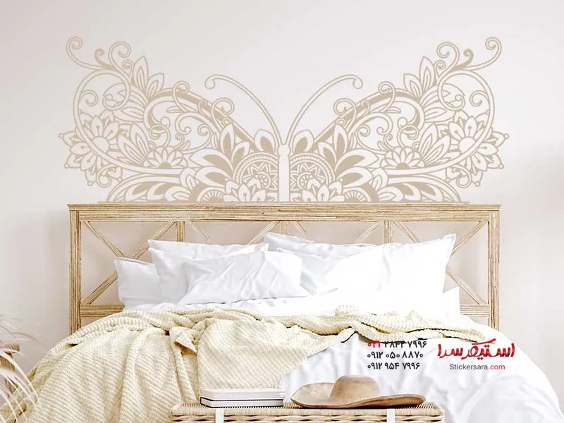 برچسب دیواری رمانتیک طرح پروانه بوهمی، نه تنها بالای تاج تخت، بلکه بالای کاناپه یا دراور هم جلوهای خیرهکننده و جاودانه دارد.