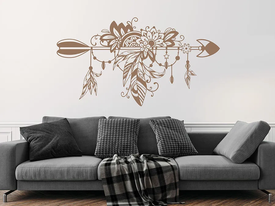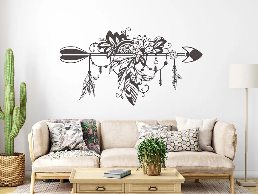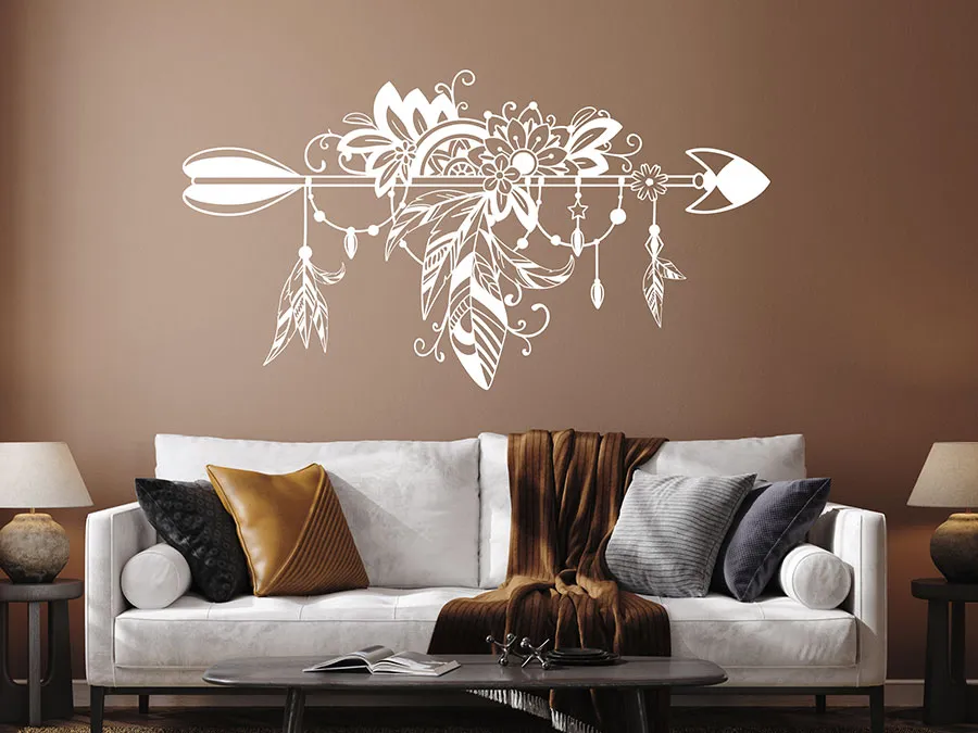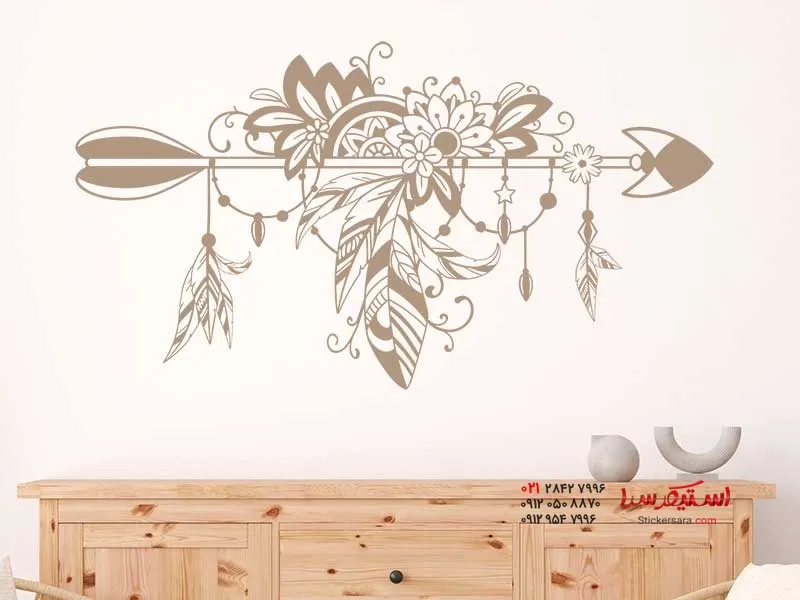 برچسب دیواری تزئینی بوهمی طرح پیکان با پر، گل، مروارید و تزئینات، یک جلوه چشمنواز و زیبا برای خانه شما یا به عنوان مثال، یک عنصر عالی برای دکوراسیون عروسی شما به سبک بوهمی است.