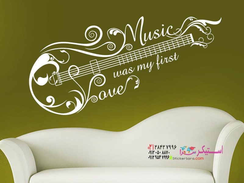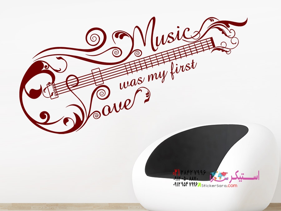 برچسب دیواری خارقالعاده «عشق اول موسیقی» ترکیبی هنرمندانه از یک ضربالمثل موسیقیایی و یک تزیین گیتار است.