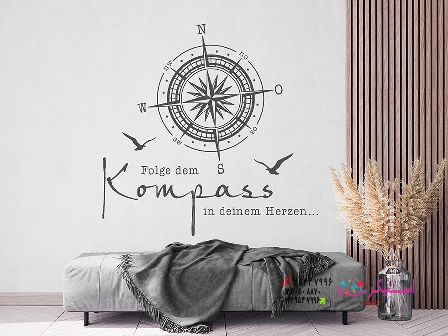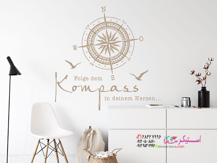 طراحی دیواری خلاقانه با عناصر دریایی و ضربالمثلی برای ایجاد فضایی دلنشین: برچسب دیواری «قطبنما را دنبال کن».