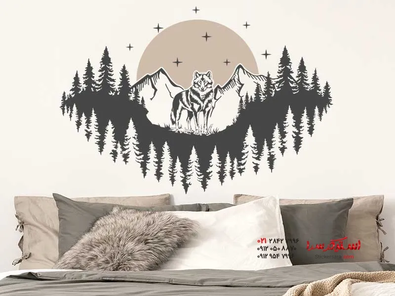 برچسب دیواری تزئینی طرح جنگل با طرح گرگ، کوه، ستاره و ماه در پسزمینه با رنگهای متضاد، جلوهای بسیار خاص و چشمنواز برای خانه شما ایجاد میکند.