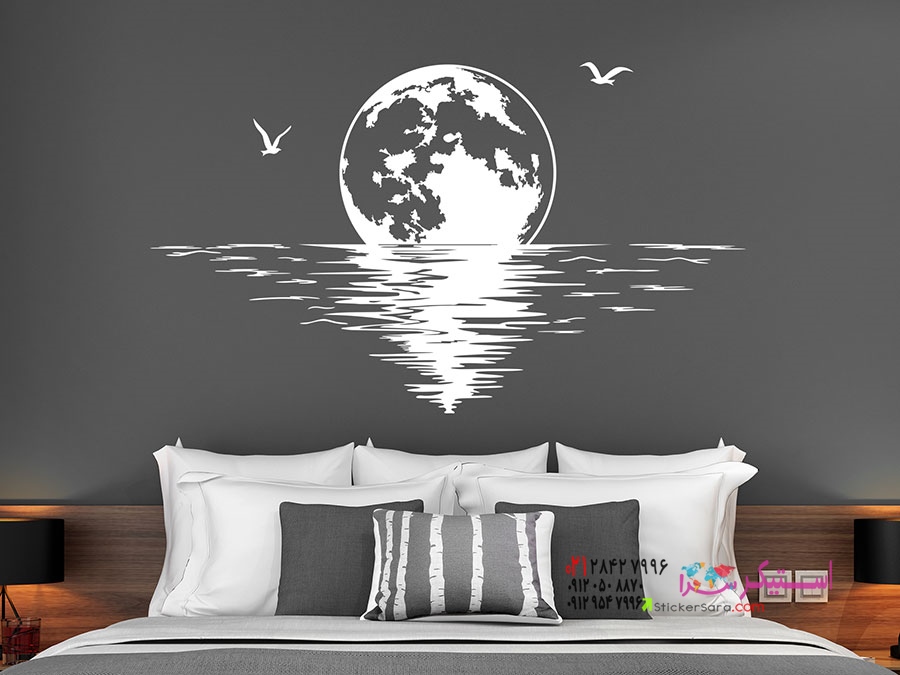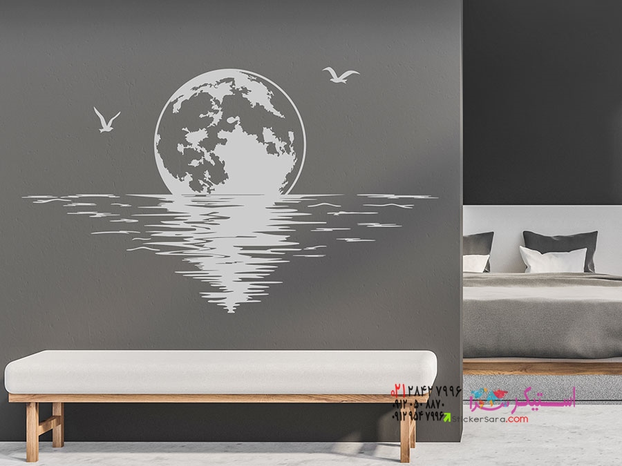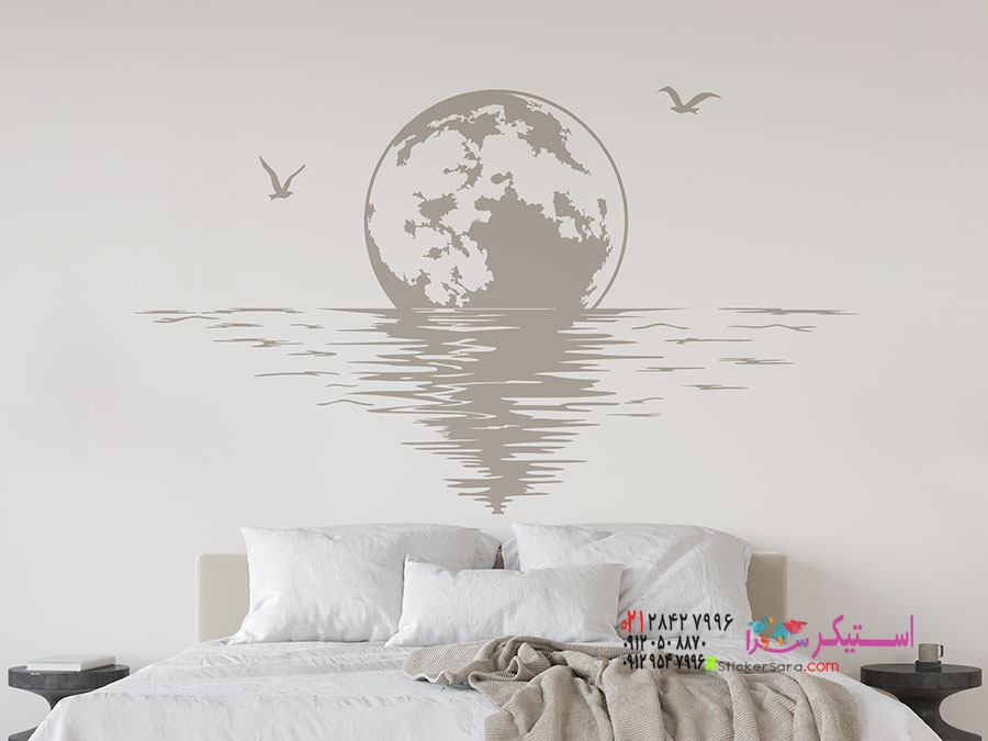 طلوع رمانتیک ماه کنار دریا برای دیوارهای اتاق خواب: برچسب دیواری ماه کامل کنار دریا.