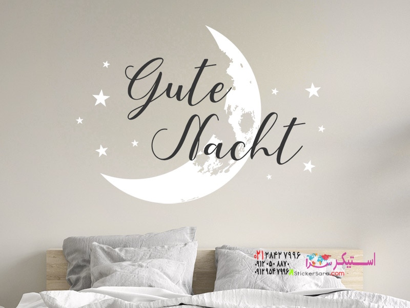 عکس برچسب روی دیوار تزیین دیوار زیبا برای اتاق خواب بالای تخت استیکر متن تایپوگرافی شب بخیر با طرح ماه و ستاره