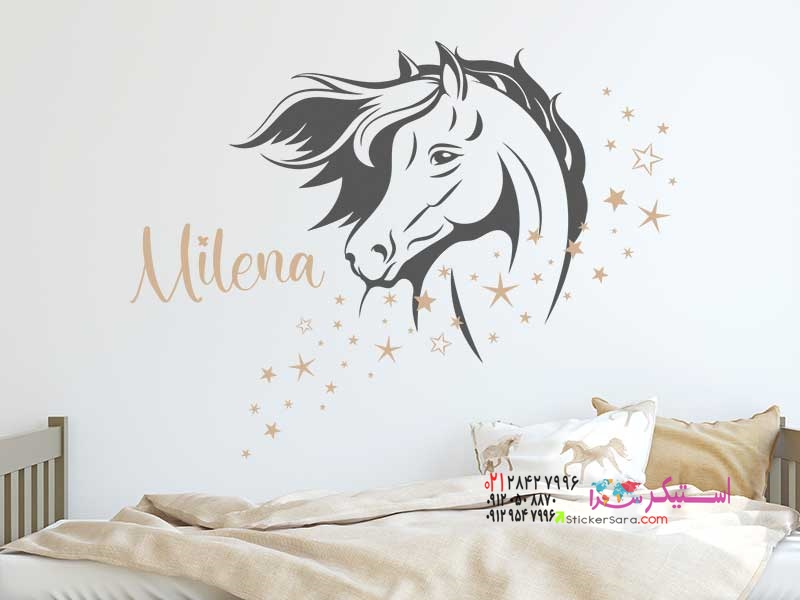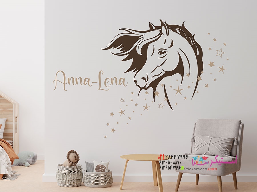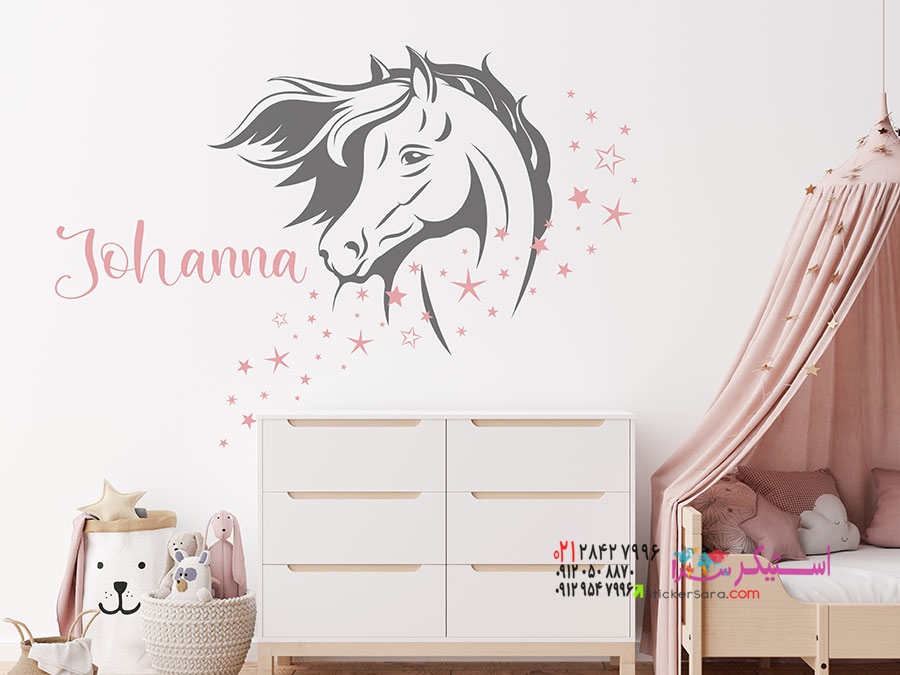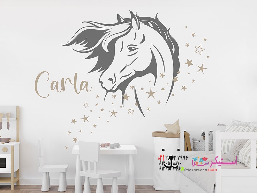 این برچسب دیواری جذاب سر اسب با ستاره و نام، ایدهای منحصر به فرد برای دکوراسیون اتاق کودکان است.