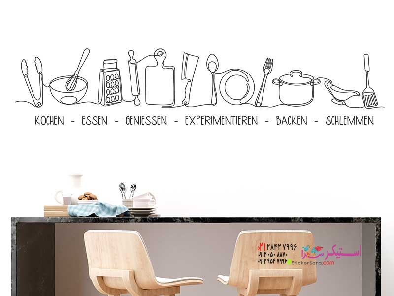 با برچسبهای دیواری تزئینی کلمات آشپزخانه با حاشیهای از ظروف آشپزخانهی طرحدار، به آشپزخانه یا اتاق غذاخوری خود ظاهری مدرن و خاص ببخشید.