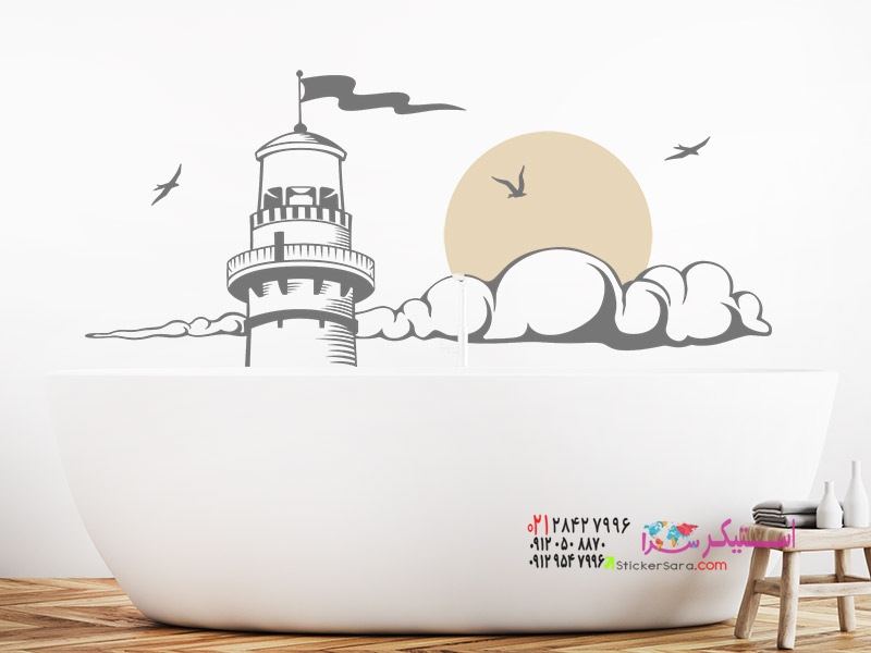 ایده طراحی دریایی برای دیوارهایتان: برچسب دیواری نوک فانوس دریایی با ابر، خورشید و مرغ دریایی.
