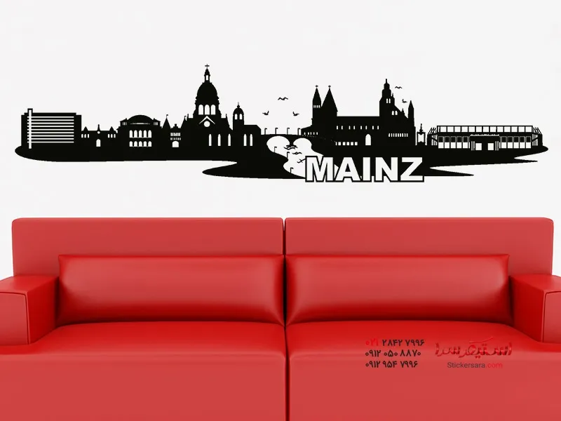 برچسب دیواری با طرح افق پایتخت راینلاند-فالتز، از جمله موارد دیگر، کلیسای جامع ماینتس، ZDF، ورزشگاه کوفیس آرنا تیم FSV ماینتس 05 و موارد دیگر را به نمایش میگذارد.