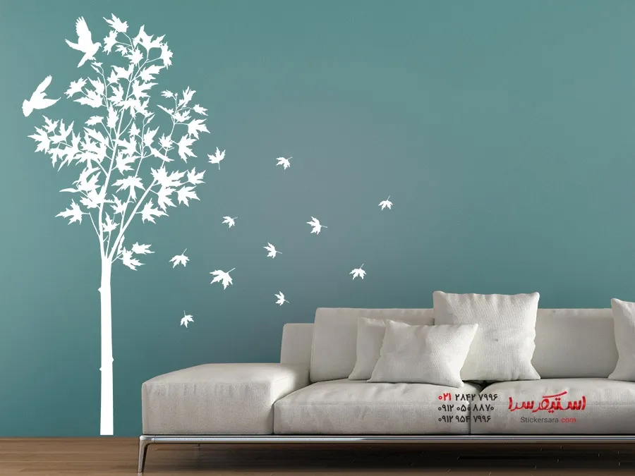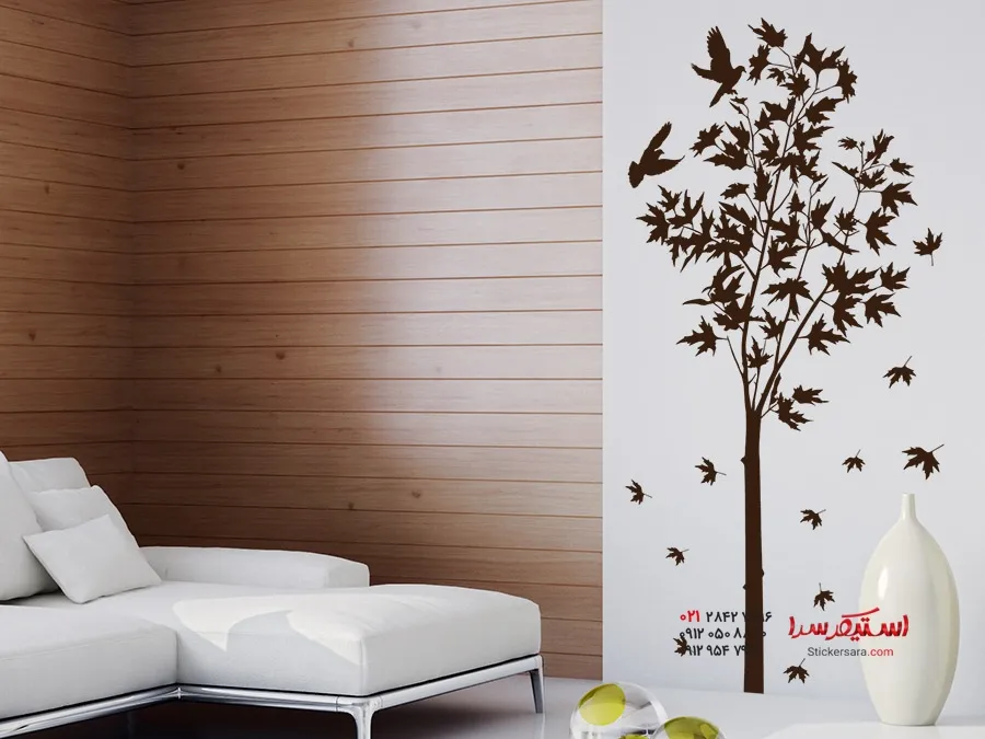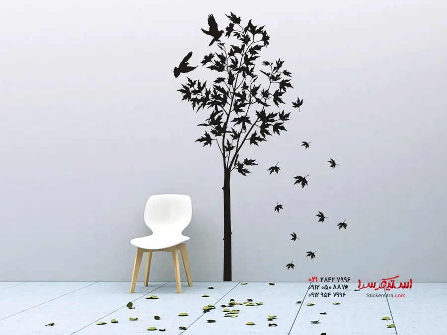 برچسب دیواری درخت افرا با طرح پرندگان و برگهای افرای در حال پرواز، یک جلوه بصری بسیار خاص و برجسته است.