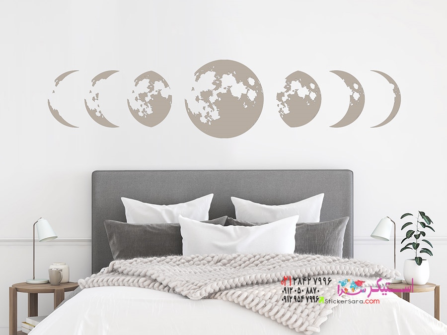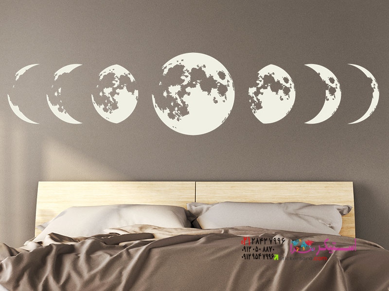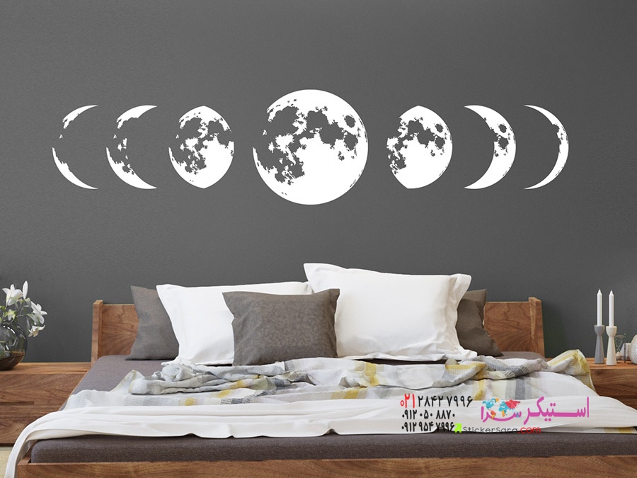 عکس برچسب دیواری مراحل ماه برای اتاق خواب بالای تاج تخت خواب