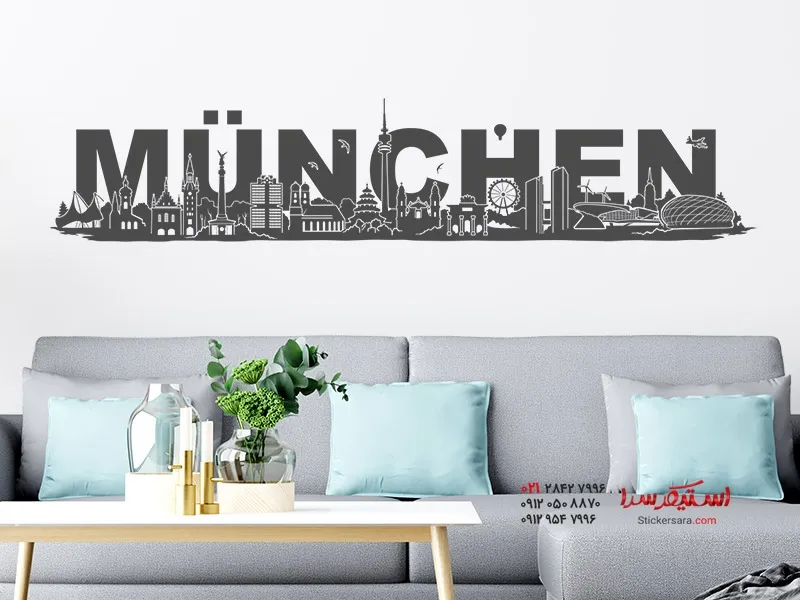 برچسب دیواری اسکایلاین مونیخ، حروف برجسته مونیخ را در مقابل نام شهر در پسزمینه نشان میدهد.