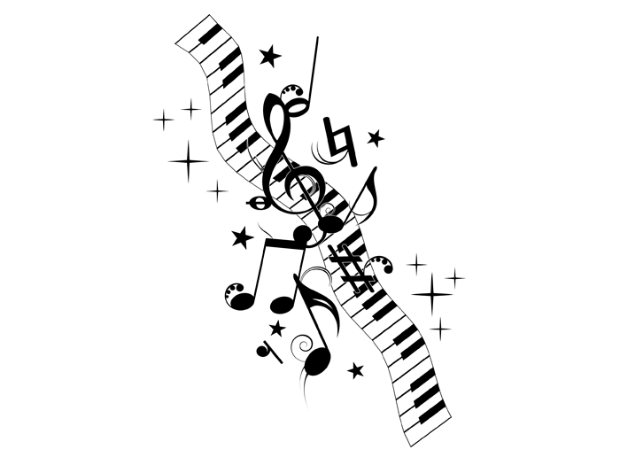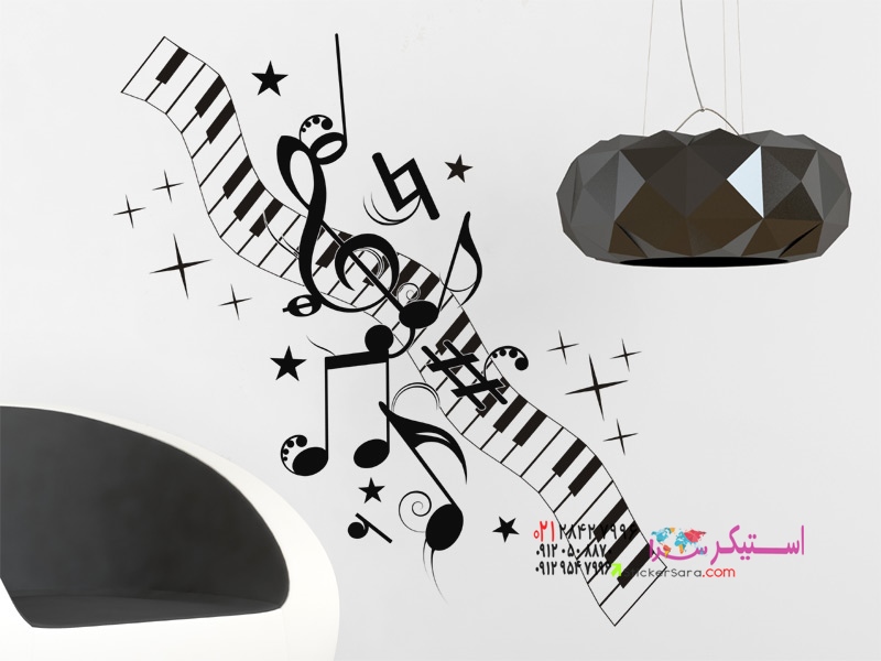 برچسب دیواری تزئینی طرح نت با کلیدهای پیانو، نتها، کلید سل و ستارهها.