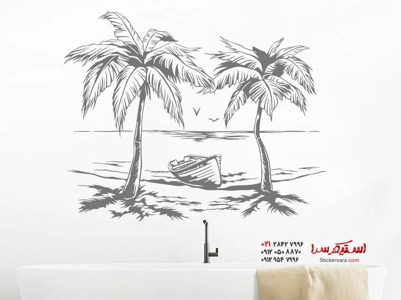 با برچسب دیواری ساحل نخل با قایق، فضایی آرامشبخش از دریای جنوب را در خانه خود ایجاد کنید.
