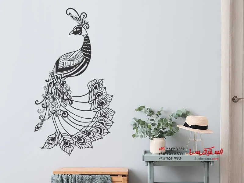 برچسب دیواری طاووس زیبا با تزئینات تزئینی، جلوهای زیبا و ماندگار به خانه شما میبخشد.