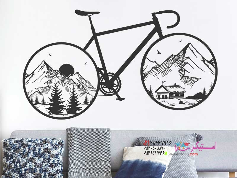 یک ایده عالی برای دکوراسیون نه تنها برای دوچرخهسواران پرشور: برچسب دیواری دوچرخه مسابقهای با منظره کوهستانی که از طریق چرخهای طرحدار قابل مشاهده است.