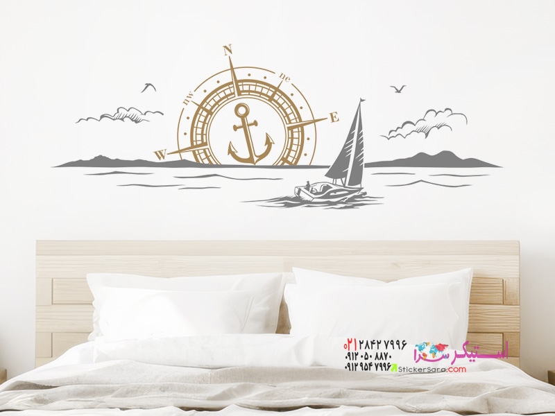 ایده الهامبخش طراحی دیوار برای یک فضای زندگی دریایی: برچسب دیواری Sea Mood with Compass.