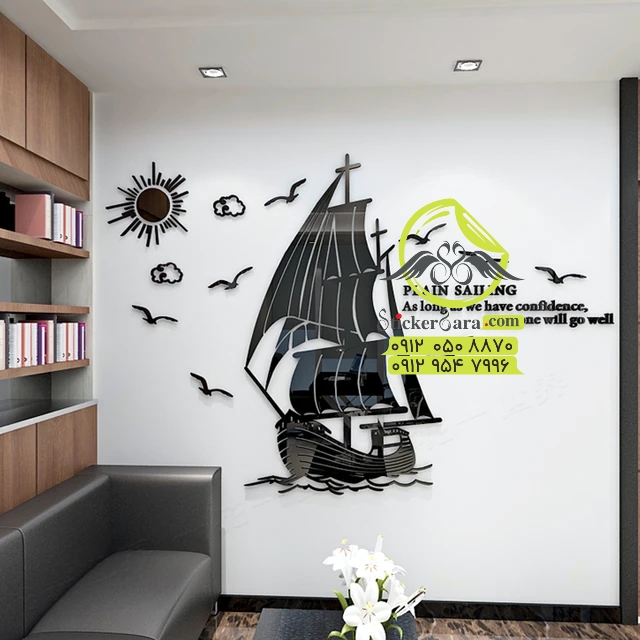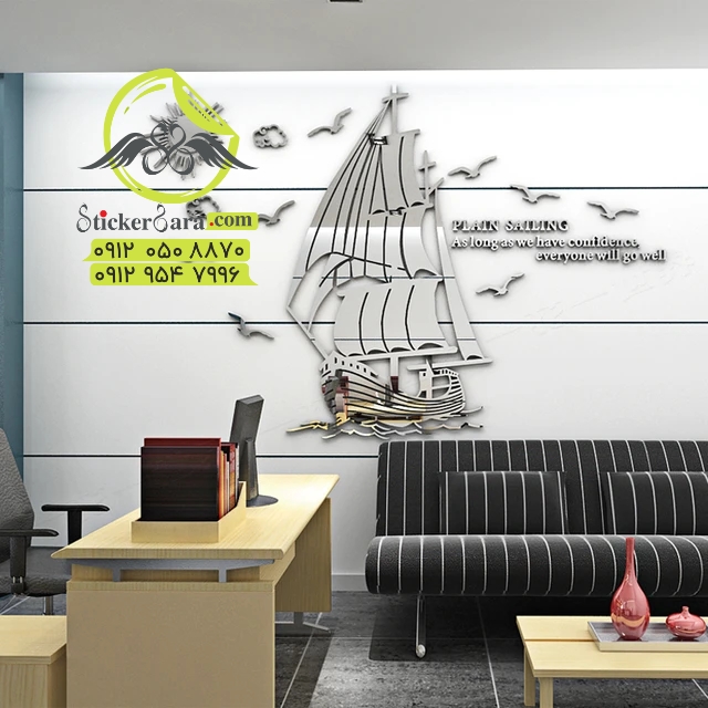 استیکر دیواری تزئینی آینه کشتی و موج سه بعدی استیکر دیواری روی دیوار تلویزیون اتاق نشیمن دیوار دکوراسیون منزل