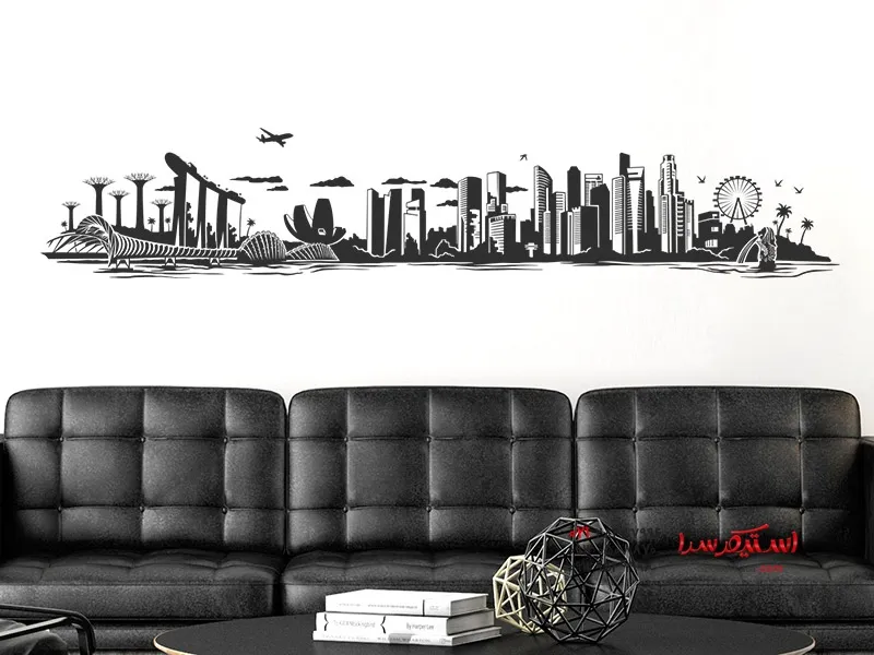 خط افق برچسب دیواری با مناظر کلانشهر آسیایی سنگاپور، هیجانانگیزترین مکانهای شهر مانند هتل مدرن مارینا بی سندز، باغهای کنار خلیج، مجسمه پارک مرلیون، چرخ و فلک سنگاپور و بسیاری دیگر را نشان میدهد.