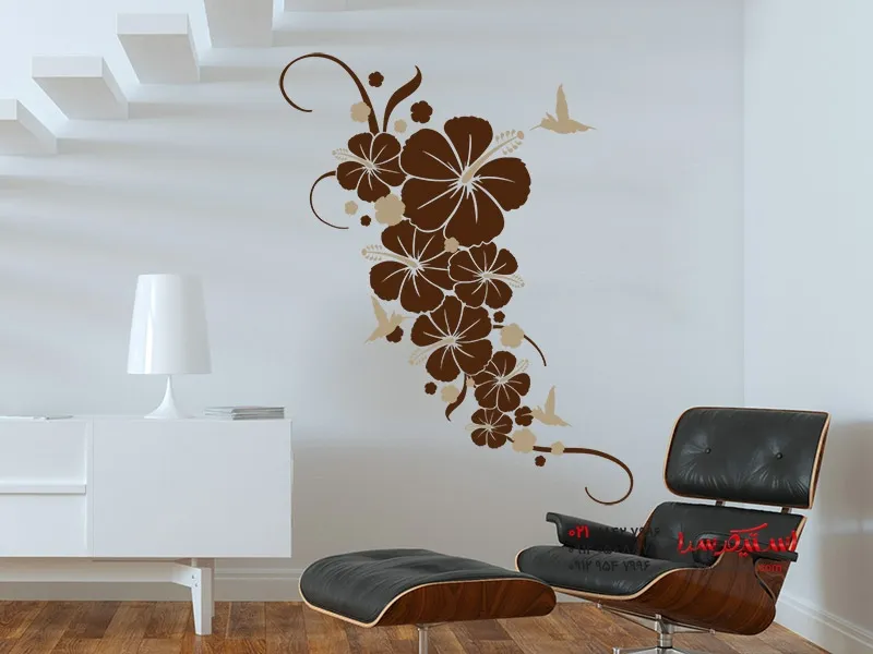 برچسب دیواری طرح گل ختمی با طرح مرغ مگسخوارهای بامزه که در اطراف بال میزنند، دریایی رنگارنگ از گلها را در دو رنگ کاملاً قابل ترکیب، روی دیوارهای شما تداعی میکند.