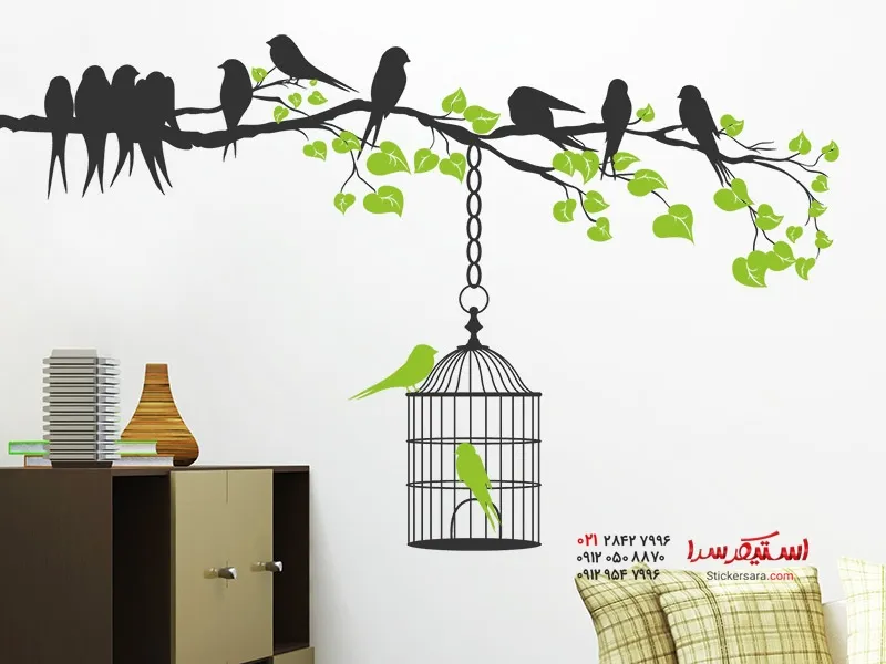 با برچسب دیواری دو رنگ طرح شاخه و قفس پرنده، میتوانید دیوارهای خود را به شیوهای متنوع تزئین کنید و فضایی بهاری ایجاد کنید.