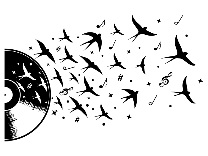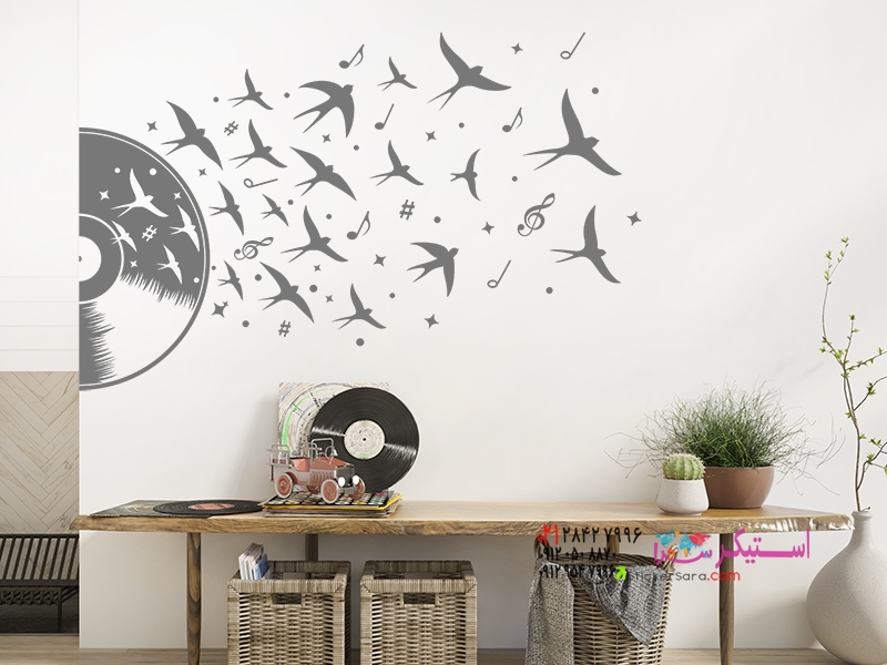 طرح اصلی برای همه طرفداران موسیقی و صفحههای گرامافون: برچسب دیواری وینیل با طرح نتهای موسیقی و پرندگان.