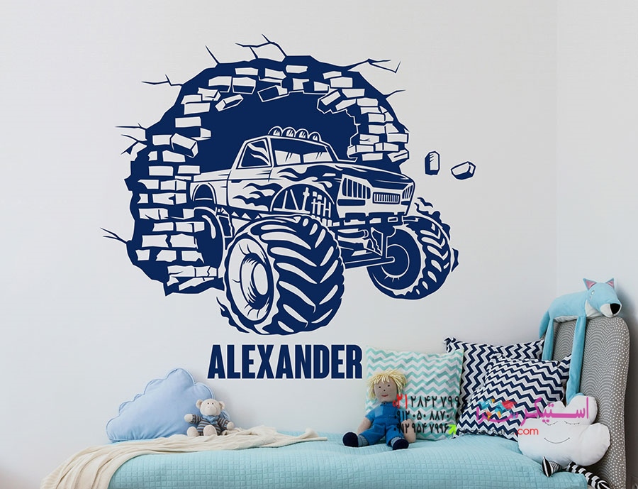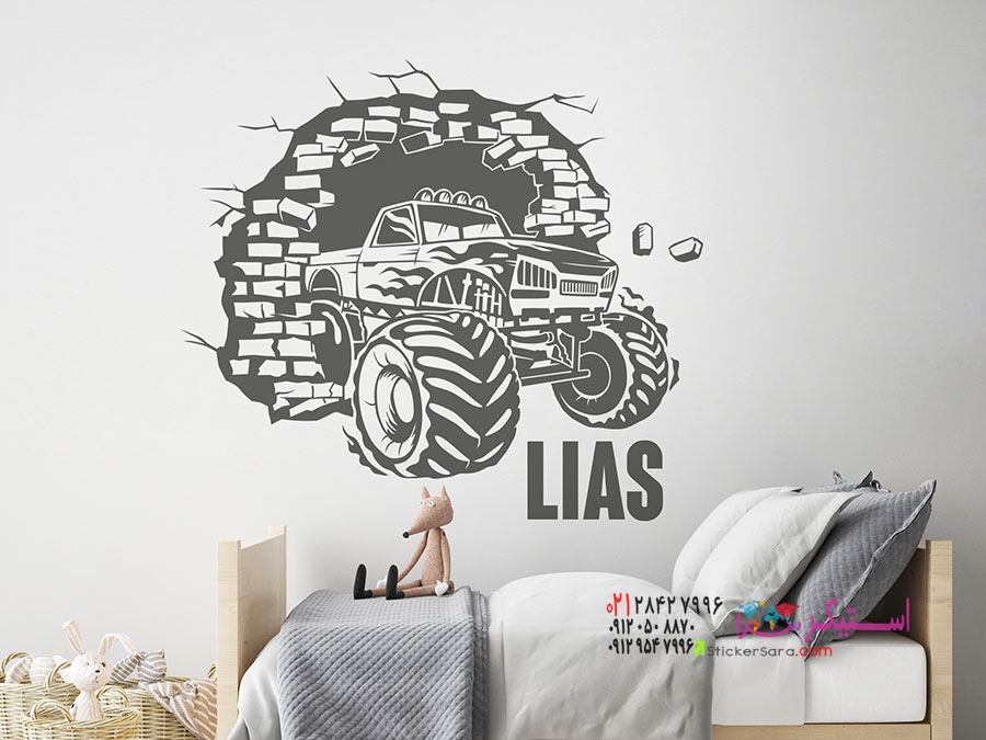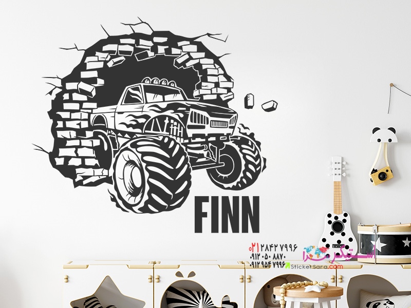 برچسب دیواری شیک کامیون هیولا با نام، طوری به نظر میرسد که از دیوار به وسط اتاق کودکان میدود و به یک عنصر چشمنواز و جذاب تبدیل میشود.