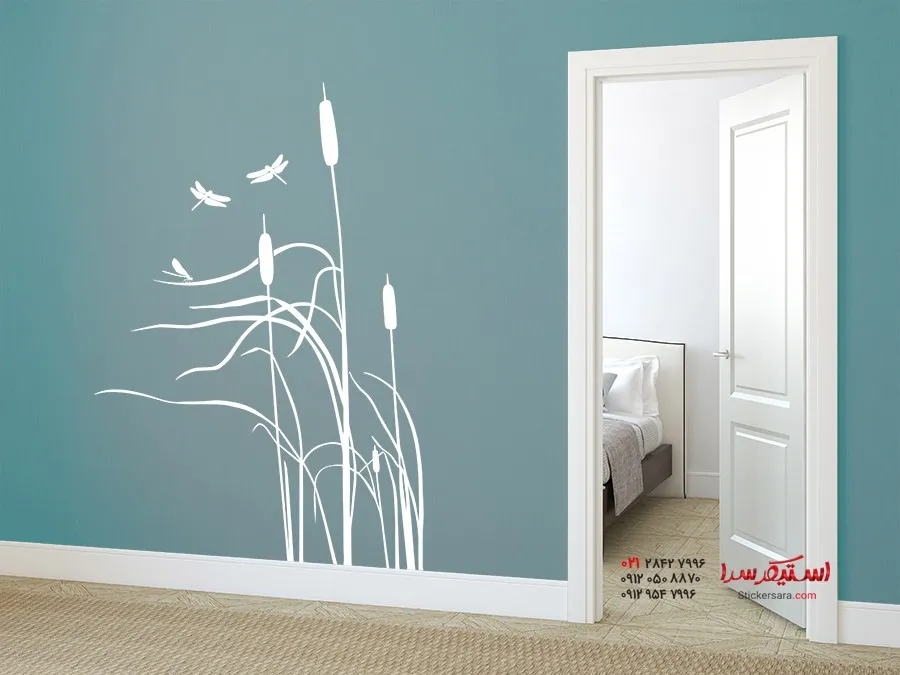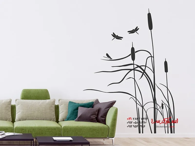 برچسب دیواری اصلی با طرح نی‌های موج‌دار و سنجاقک، هم در فضای نشیمن و هم در راهرو یا حمام بسیار تزئینی به نظر می‌رسد و باعث می‌شود اتاق سرزنده به نظر برسد.
