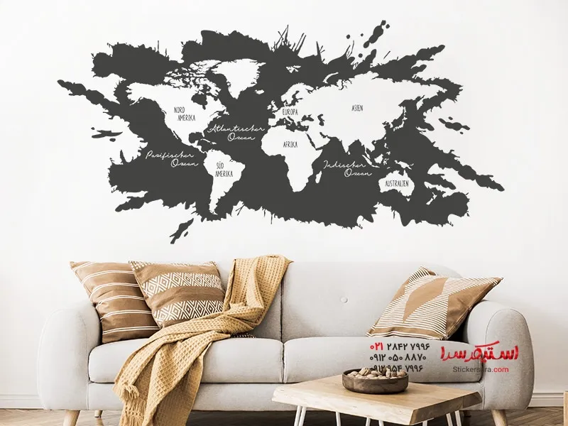 نکته: از آنجایی که قارهها و جزایر پانچ شدهاند، رنگ دیوار در این نقاط از طریق برچسب دیواری میدرخشد.