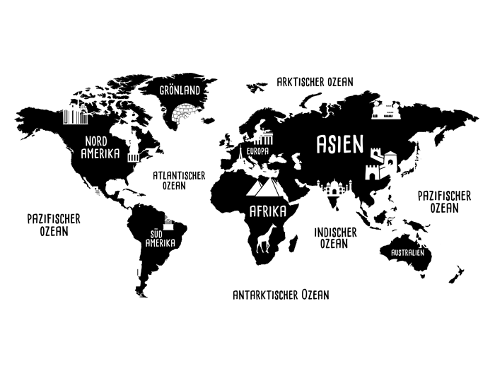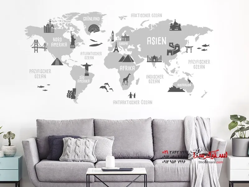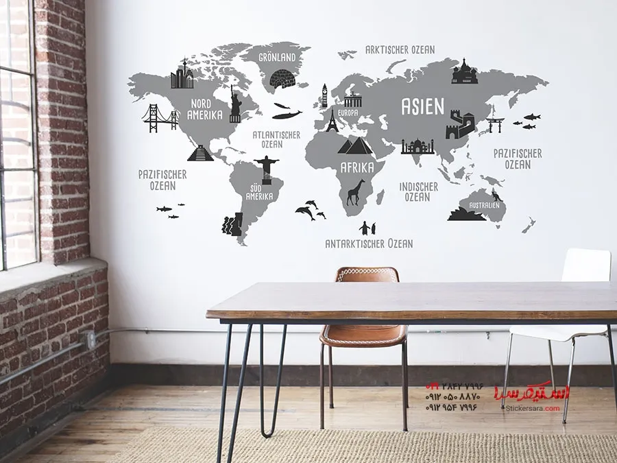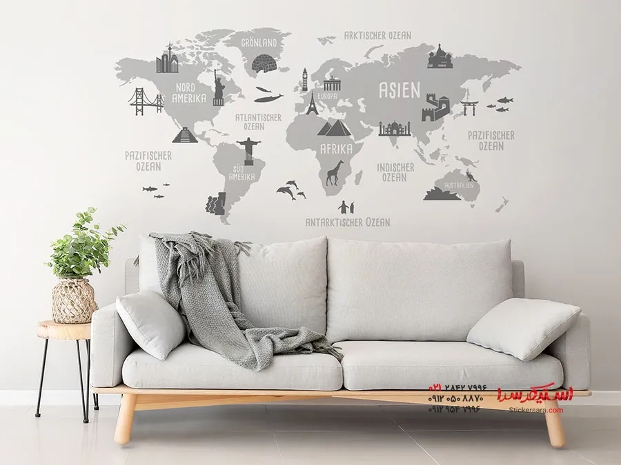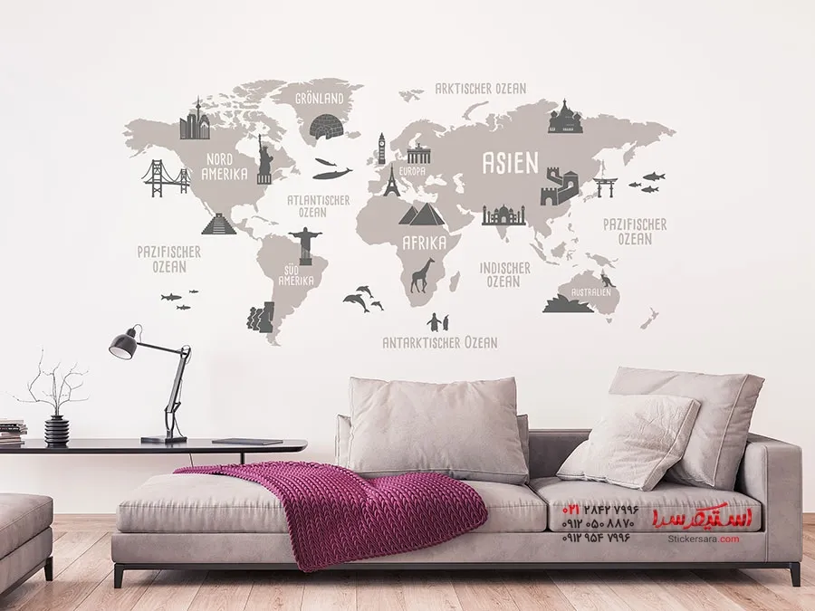 برچسب دیواری نقشه جهان با تصاویر مکانهای دیدنی مانند دروازه براندنبورگ، بیگ بن، برج ایفل، مجسمه آزادی، دیوار بزرگ چین و غیره، نه تنها در اتاق نشیمن، بلکه در اتاق مطالعه یا اتاق نوجوان نیز جلوهای جذاب و هیجانانگیز ایجاد میکند.