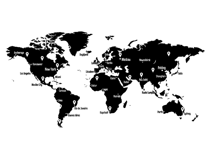 شهرها و کلانشهرهای زیر در این نقشه جهان نشان داده شدهاند: نیویورک، ونکوور، لسآنجلس، انکوریج، میامی، مکزیکوسیتی، کاراکاس، لیما، ریودوژانیرو، بوئنوس آیرس، ریکیاویک، لندن، پاریس، لیسبون، اسلو، برلین، رم، مسکو، قاهره، داکار، لاگوس، نایروبی، کیپ تاون، دبی، دهلی نو، نووسیبیرسک، پکن، شانگهای، کوالالامپور، توکیو، پرت، سیدنی.